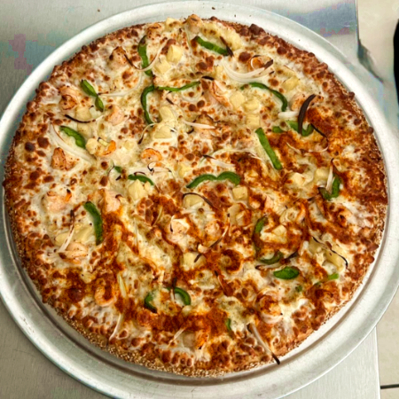Deliciosa pizza hecha con; pimiento verde, cebolla, piña y camarones sazonados, acompañado con nuestro delicioso aderezo de ajo. hecho con pan suave y fresco, con orilla de ajonjolí