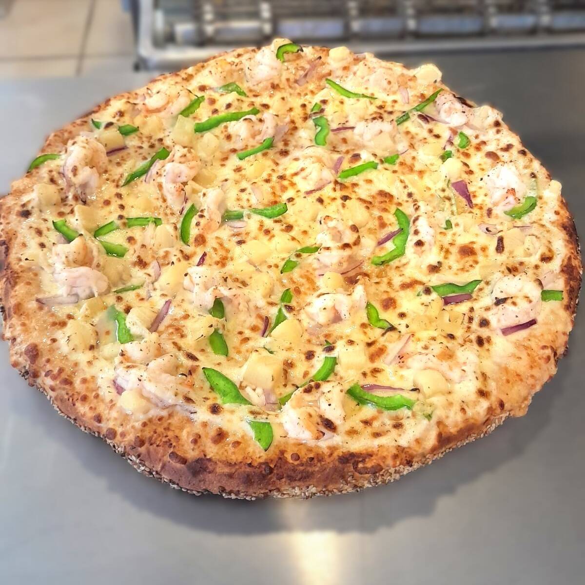 prueba nuestra deliciosa pizza hecha con: pimiento verde, cebolla, piña, camarones frescos sazonados aderezo de ajo acompañado con salsa de chipotle picosa., hecho con pan suave y fresco, con orilla de ajonjolí