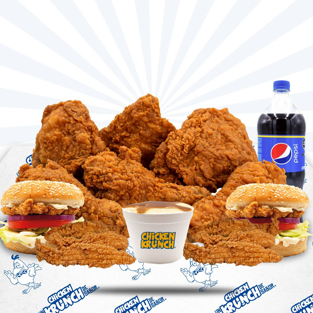 6 Pzs Krunch + 2 Hamburguesas Krunch + 4 Tiras Krunch + 1 Ref 1.5L + 1 Complemento Familiar