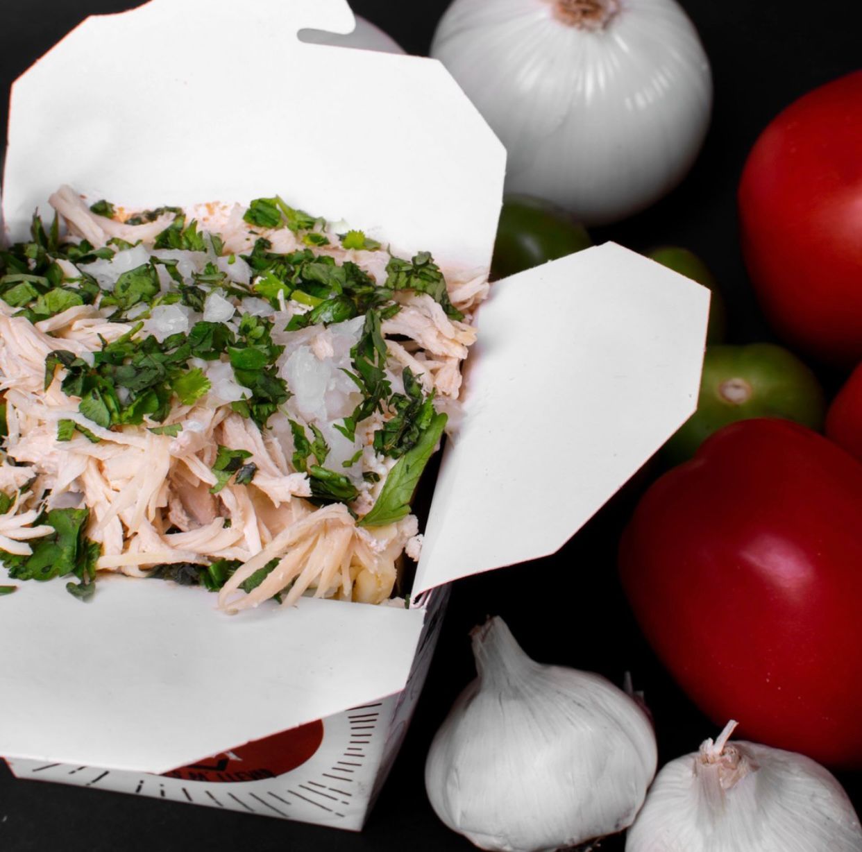 Deliciosa pechuga de pollo desebrada, elige tu salsa, barra fría y complementos.