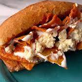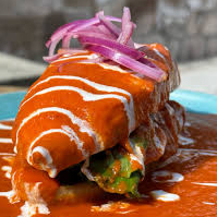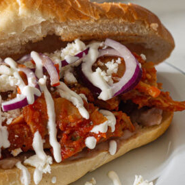Lonche de pierna bañado en una salsa sabor a chipotle acompañado de cebolla curtida aguacate y crema