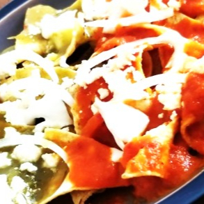 Deliciosos chilaquiles Mixto salsa verde y salsa roja Acompañados De queso crema aguacate y cebolla( Favor de indicar Si no desea algún ingrediente ¿O cómo lo desea preparado En caso de los Huevos Bien cocidos o revueltos)