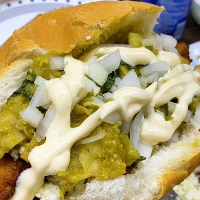 Delicioso lonche de pierna bañado en salsa de tomate verde, con cebolla curtida aguacate crema y jalapeño