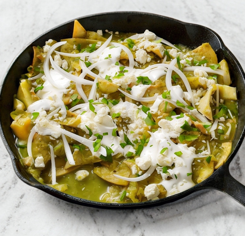 Platillo individual: deliciosos chilaquiles verdes de salsa tatemada, preparados con queso y crema 🌶️🍽️
