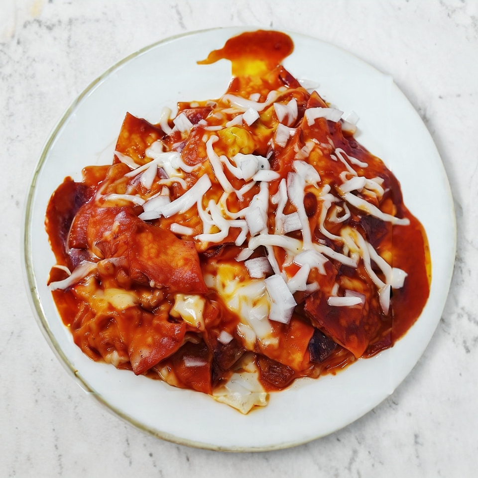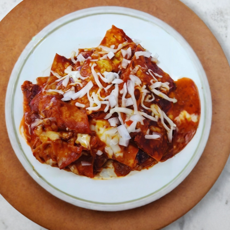 Platillo individual: deliciosos chilaquiles rojos de salsa tatemada, preparados con queso y crema 🌶️🍽️