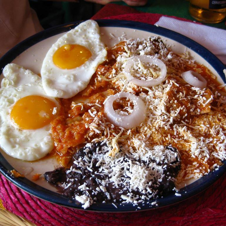 Nuestros deliciosos chilaquiles rojos tatemados con huevo estrellado encima
