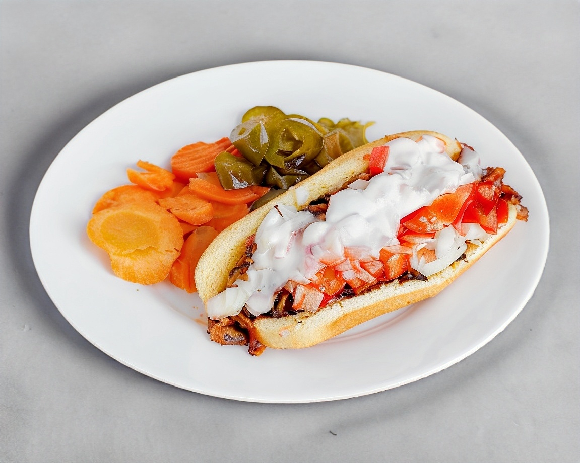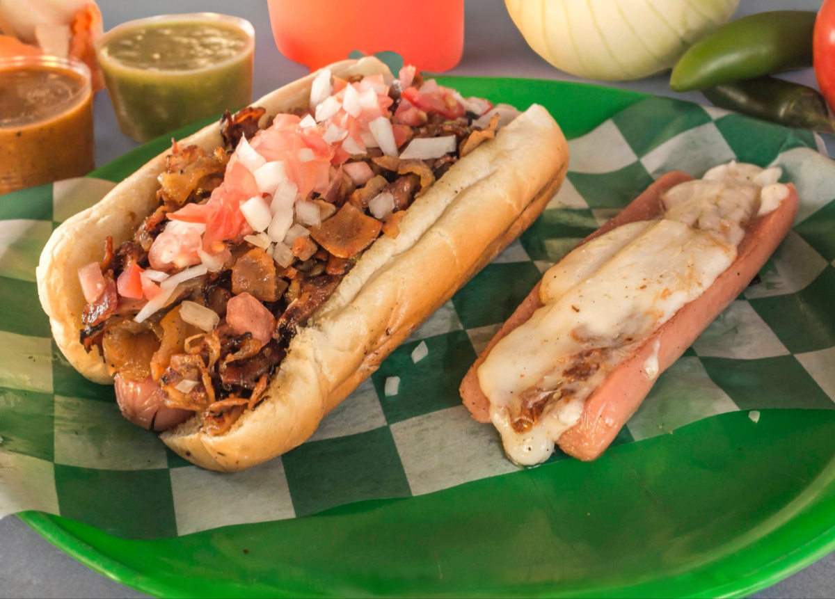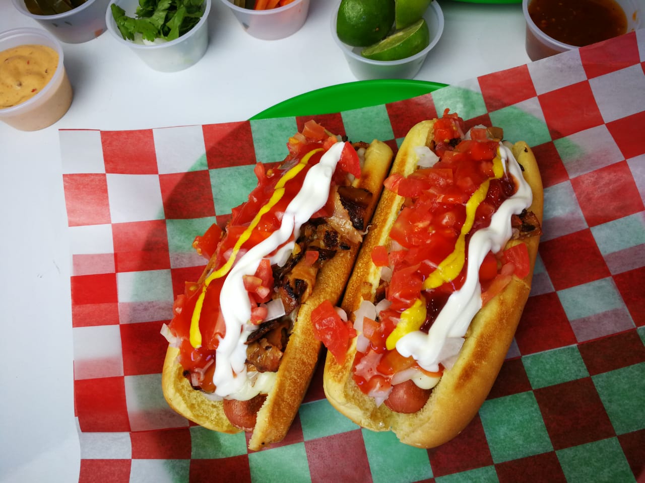 pan de hot dog calientito con salchicha doradita, aderezo y verdura (cebolla y tomate).