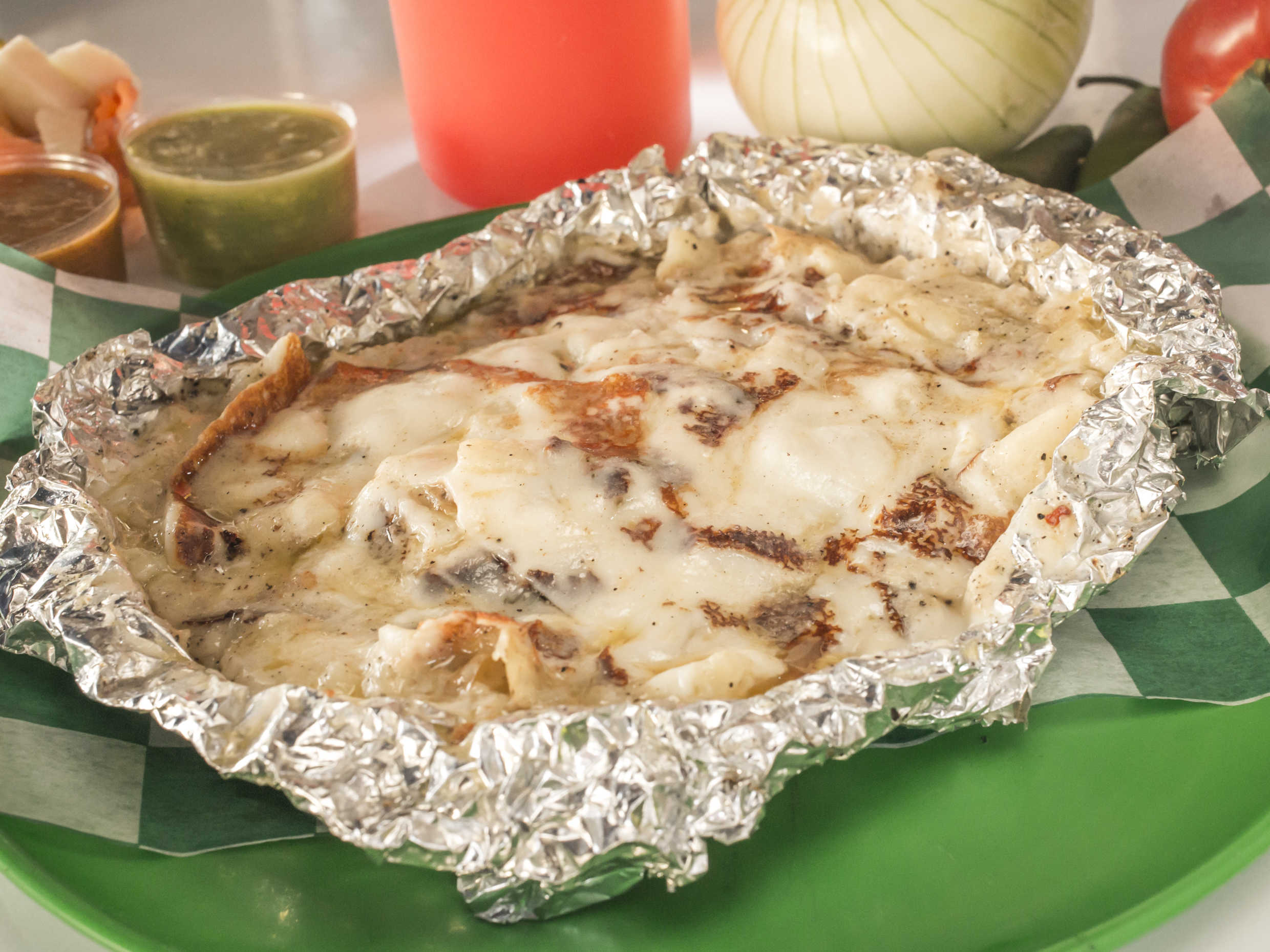 Costra de queso con carne asada,jamon, tocino y pimiento morron y cubierta con su tortilla de maiz