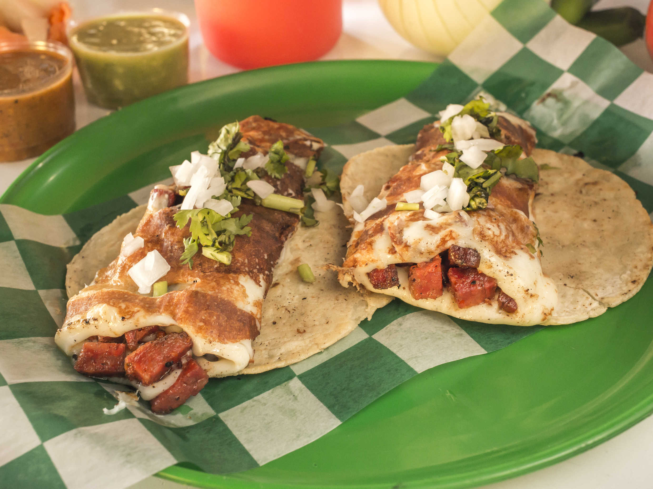 Tacos de Tortilla mediana Asada, tocino, pimiento morrón y cebolla.