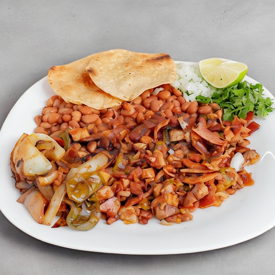 Se pesan 150gr de chorizo al carbón en el plato y se pone una porción de frijol de la olla, incluye tortillas, no lleva verdura