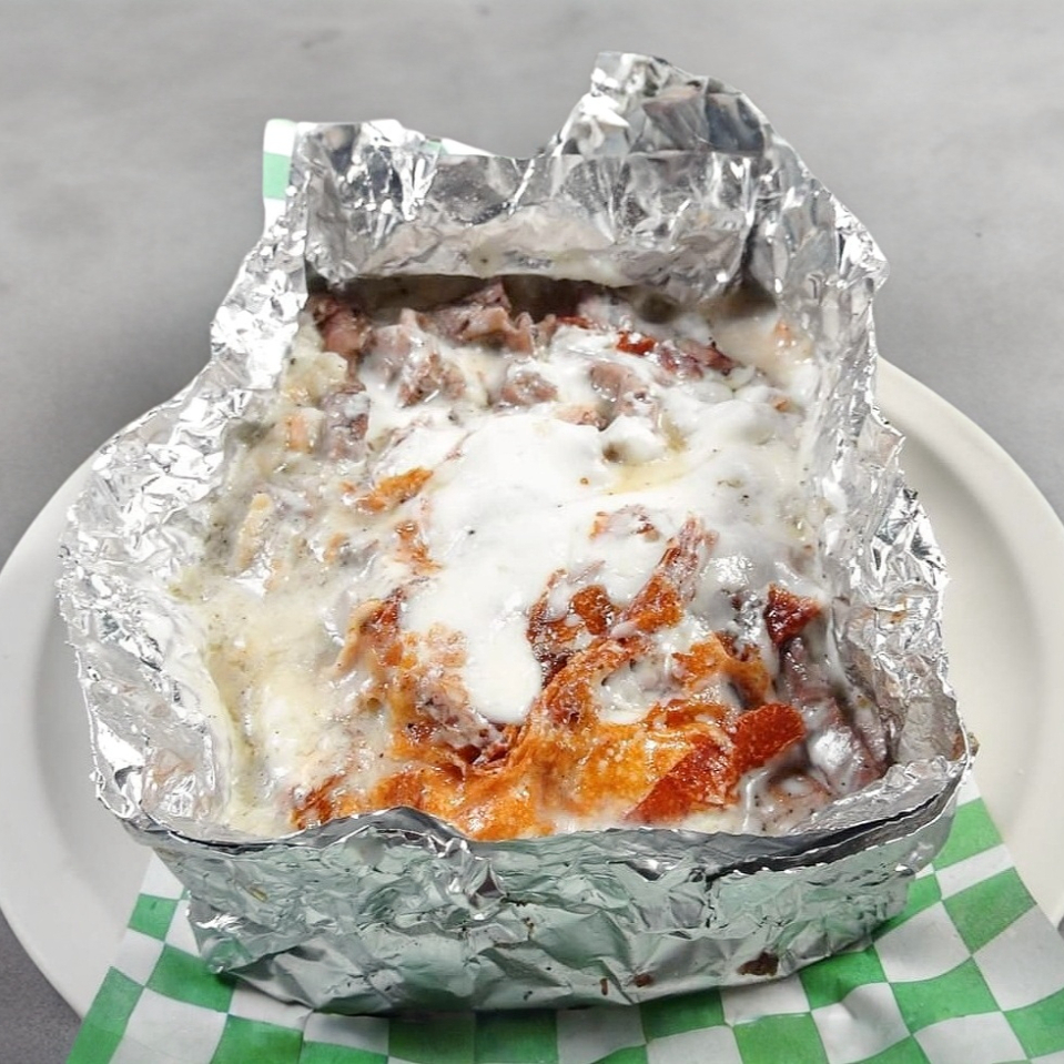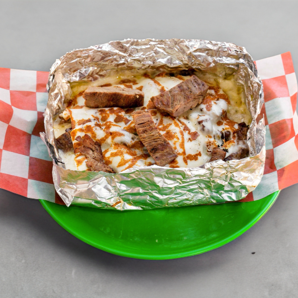 Papa de Alambre (bistec con adobada, pimiento morrón y cebollita cambray), con crema y queso