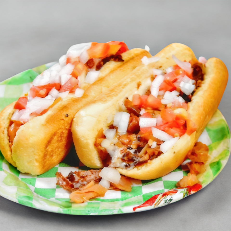 Hot dog chiles sin pan: Salchicha de pavo doradita con aceite, queso manchego, preparado (combinación de jamón con tocino) con jitomate, cebolla y aderezos
