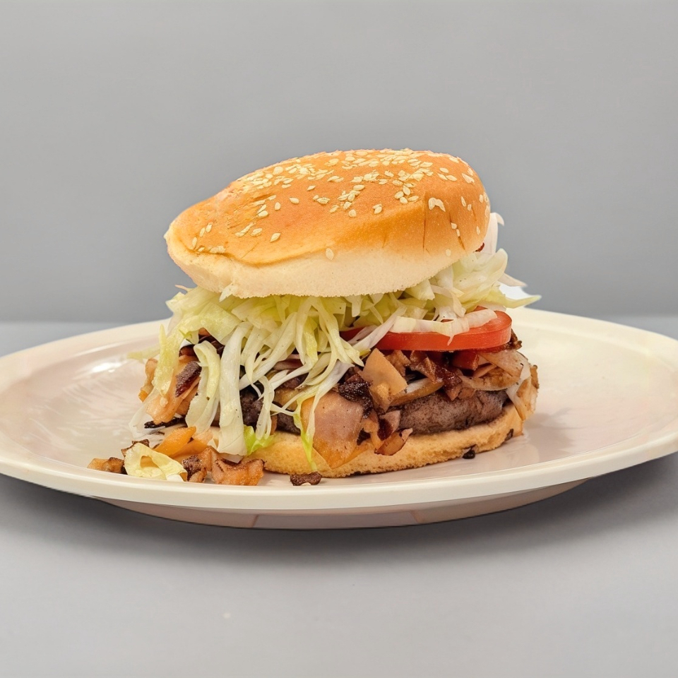 Pan con ajonjolí, carne molida de res al carbón, queso blanco, queso amarillo, una rebanada de piña, verdura y aderezos