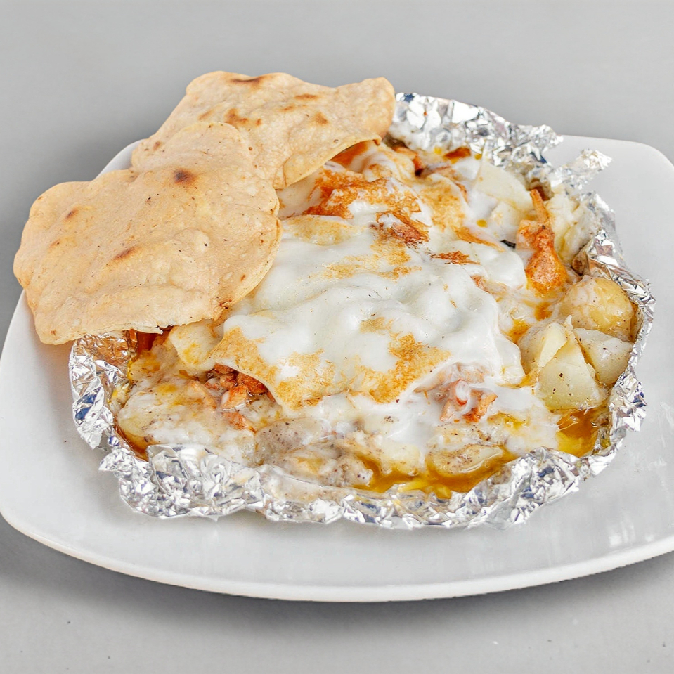Costra de queso relleno de las dos carnes a tu elección, partido en dos y con tortilla de maíz en la base