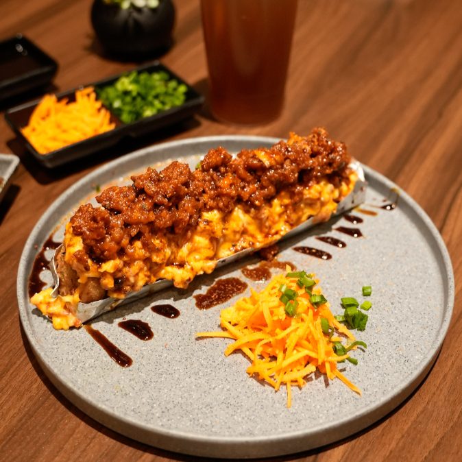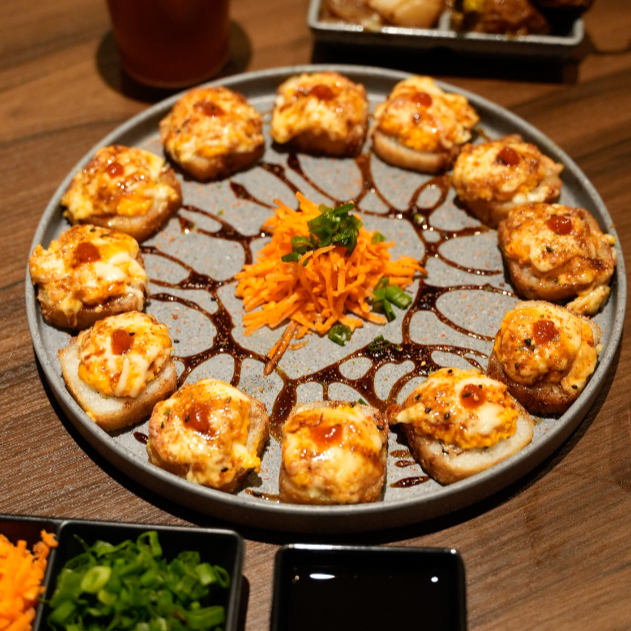 Camarón y tocino por dentro. gratinado con aderezo de chipotle, camarón, tocino y serrano, al horno. togarachi encima.