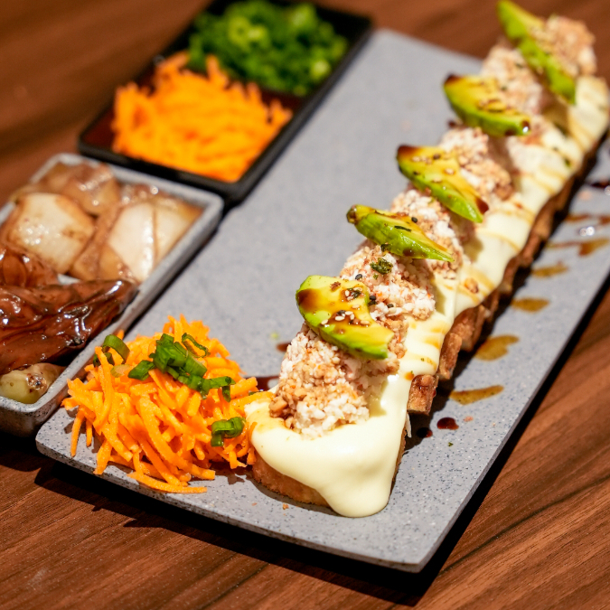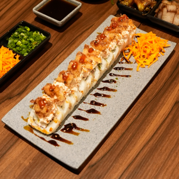 Camarón empanizado por dentro. philadelphia, surimi y aguacate por fuera coronado con ensalada de kanikama, camarón empanizado, philadelphia, salsa de anguila y togarachi.