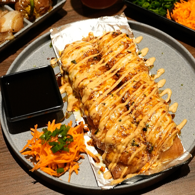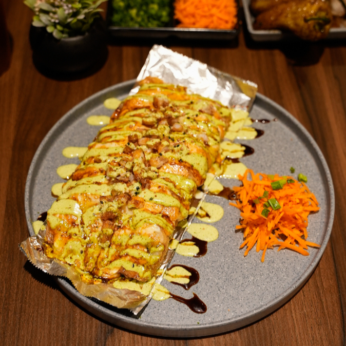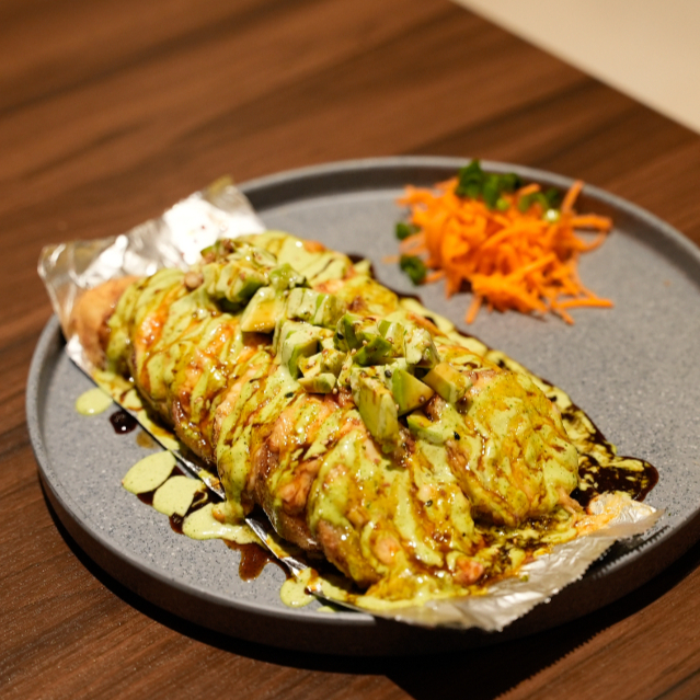 Res, pollo y tocino por dentro. topping de tampico, gratinado con aderezo de chipotle, philadelphia, res y tocino al horno. coronado con trozos de aguacate, salsa de anguila y ajonjolí.(empanizado)