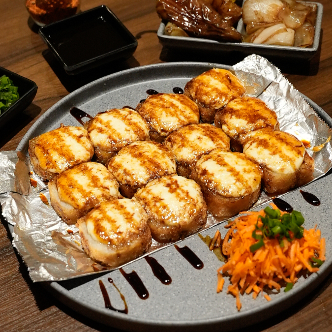 Res y pollo por dentro. gratinado pieza por pieza, aderezo de chipotle y salsa de anguila al horno. (empanizado)