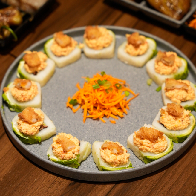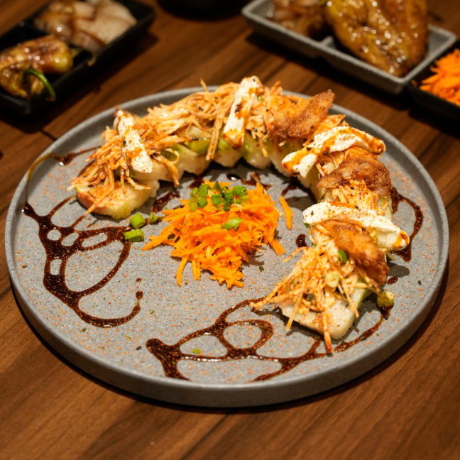 Rollos rellenos de nuestra pasta especial chila (2 piezas) acompañados de aderezo agridulce.