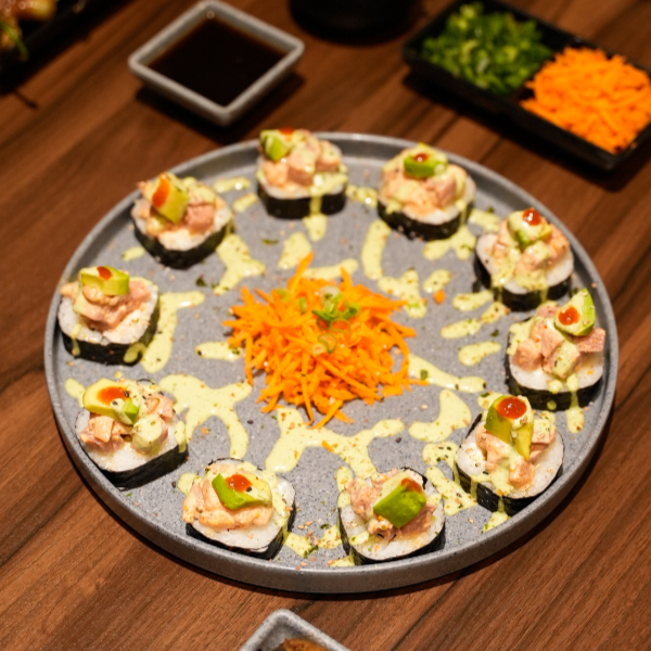 Camarón y surimi empanizado, tampico por dentro. topping de atún y salmón, al massago. coronado con aguacate, aderezo de cilantro, puntos de sriracha y ajonjolí. (natural, con alga por fuera)