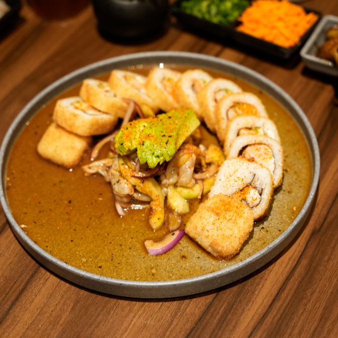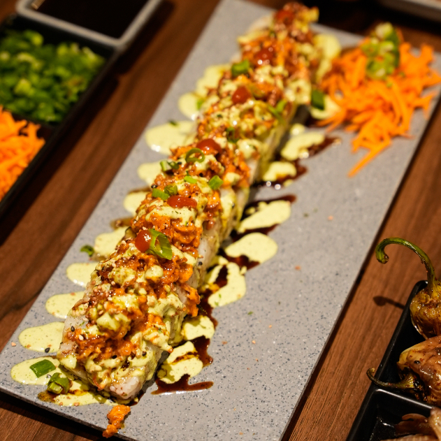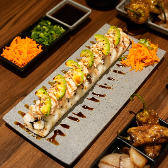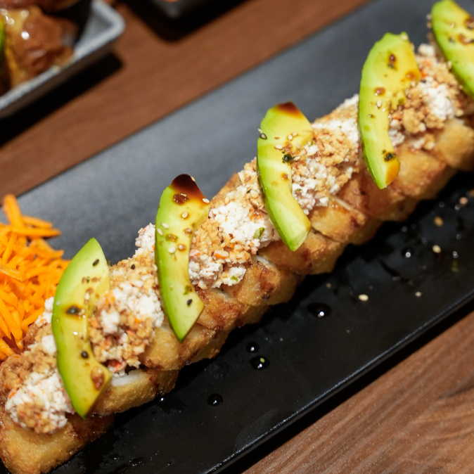 Camarón empanizado y atún por dentro. camarón, aguacate y philadelphia por fuera. coronado con ensalada de kanikama, trocitos de aguacate y limón. salsa de anguila, puntos de sriracha y ajonjolí. con espejo de aderezo de cilantro.