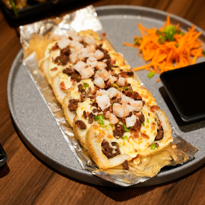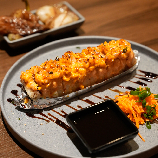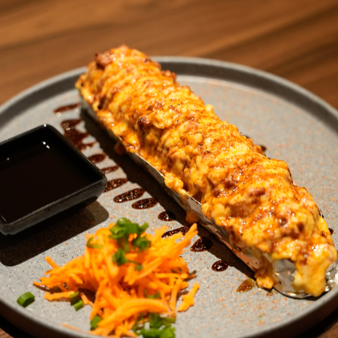Camarón y res por dentro. topping de tampico spicy y chihuahua al horno. bañado en salsa de anguila, puntos de sriracha y togarachi. (empanizado)
