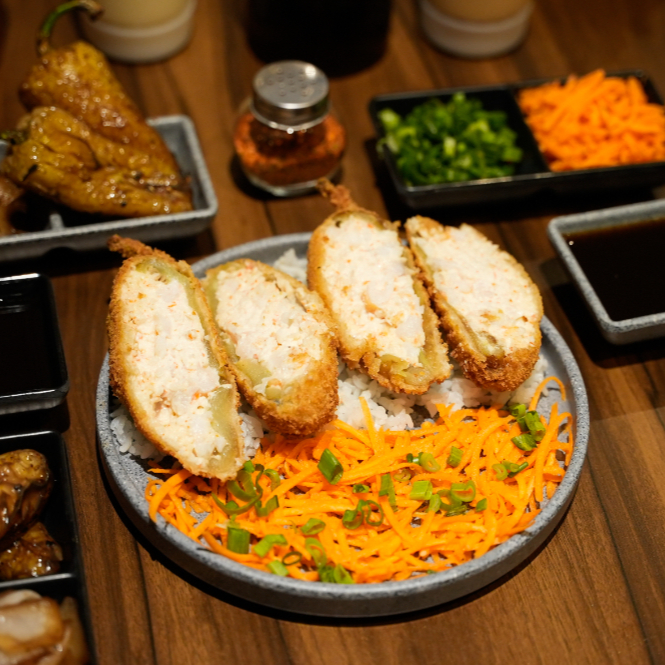 Chile caribe relleno de philadelphia, tampico,res, pollo, y arroz. gratinado especial picosito coronado con aguacate.(1 pieza)