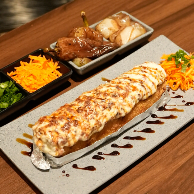 Res, pollo y tocino por dentro. topping de 3 carnes, philadelphia y chihuahua, al horno. bañado en salsa de anguila. (empanizado)