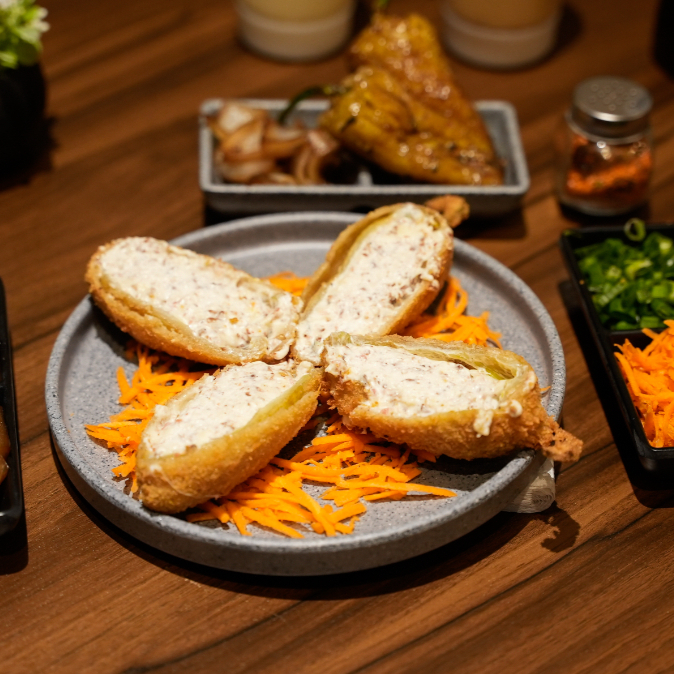 Camarón y res por dentro. queso chihuahua, camarón, res y serrano, al horno.(empanizado)