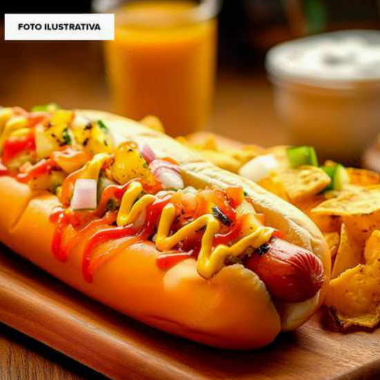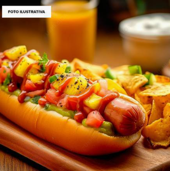 Hot dog con salchicha de pavo, tocino y chorizo. Preparado a tu gusto con 5 toppings a elegir. (Jitomate, cebolla, mostaza, cátsup, crema, chorizo, panela, piña, cebolla asada, chile toreado, 5 toppings, papas doradas y nachos. Papas doradas fritas.