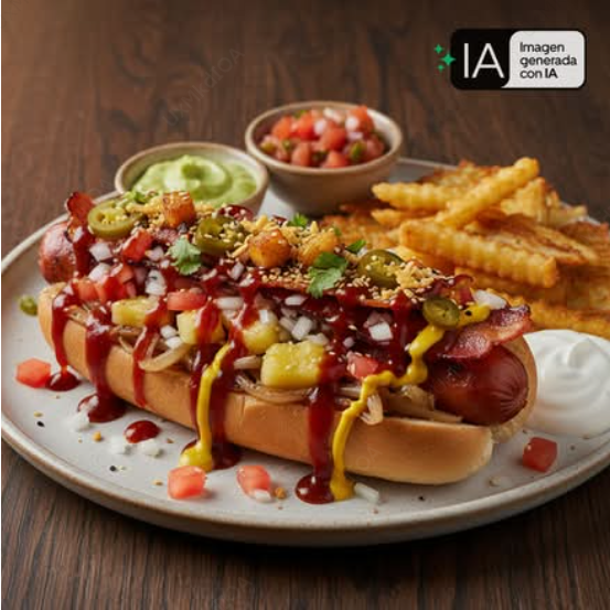 Hot dog con salchicha de pavo, tocino, chorizo y guacamole acompañado de 5 toppings a elegir ( jitomate, cebolla, mostaza, cátsup, crema, chorizo, panela, cebolla asada, piña, chile toreado, 5 toppings, papas doradas y nachos. Papas doradas fritas)