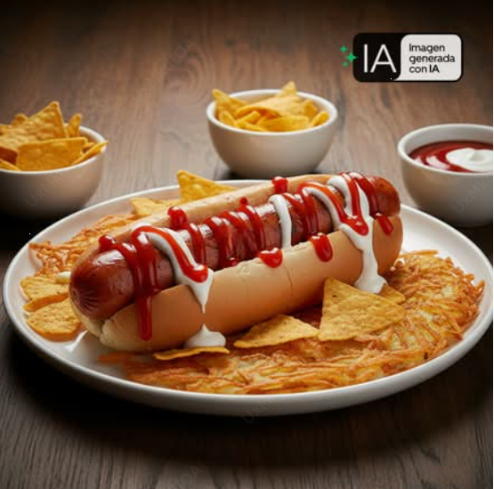 Salchicha de pavo con tocino, preparada con cátsup y crema, papas doradas y nachos. Papas doradas fritas a tu elección.