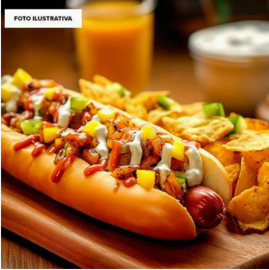 Hot dog con salchicha de pavo, tocino, chorizo y BBQ. Acompañado de 5 toppings a elegir (jitomate, cebolla, mostaza, cátsup, crema, cebolla asada, piña, 5 toppings, papas doradas y nachos. Papas doradas fritas.)