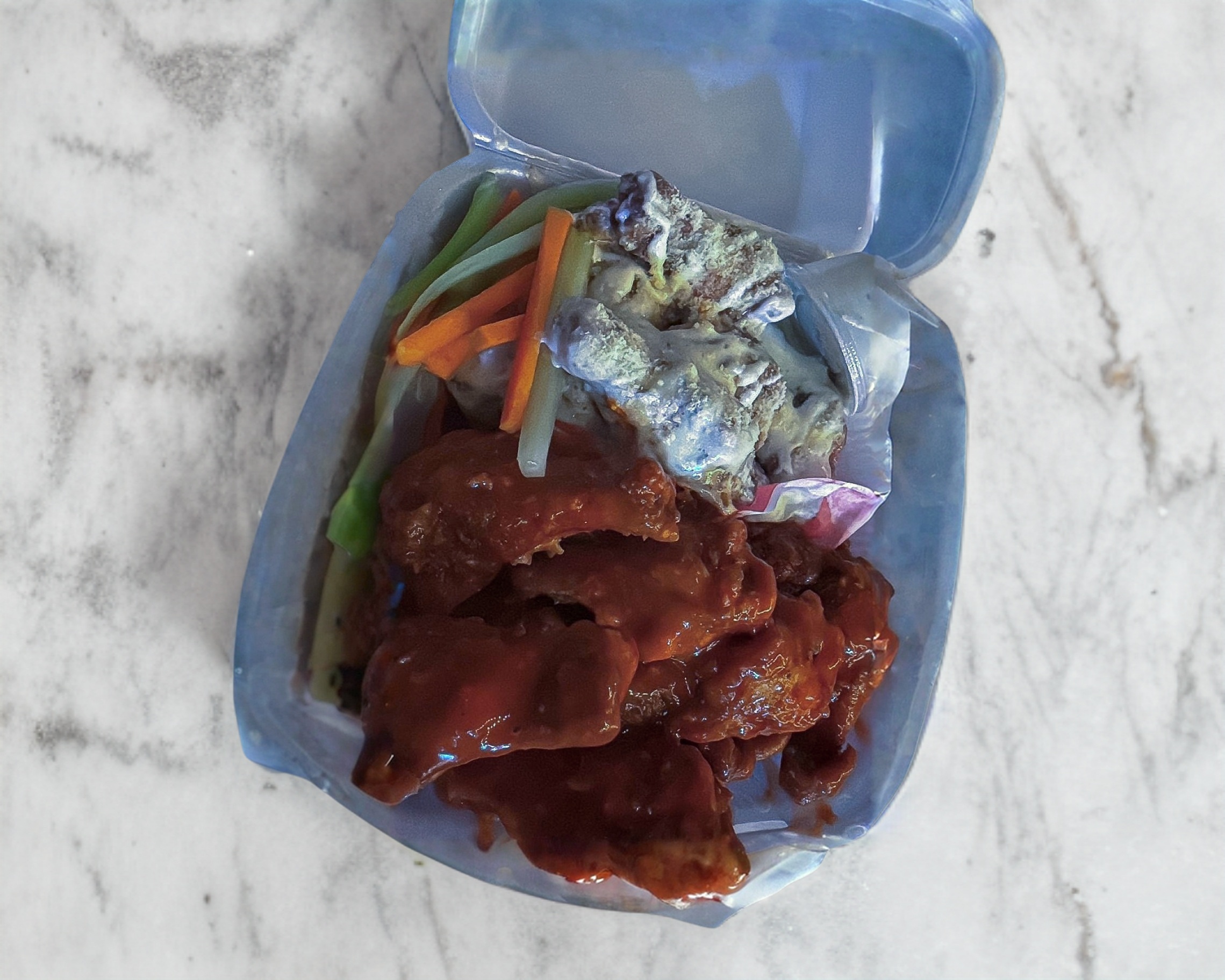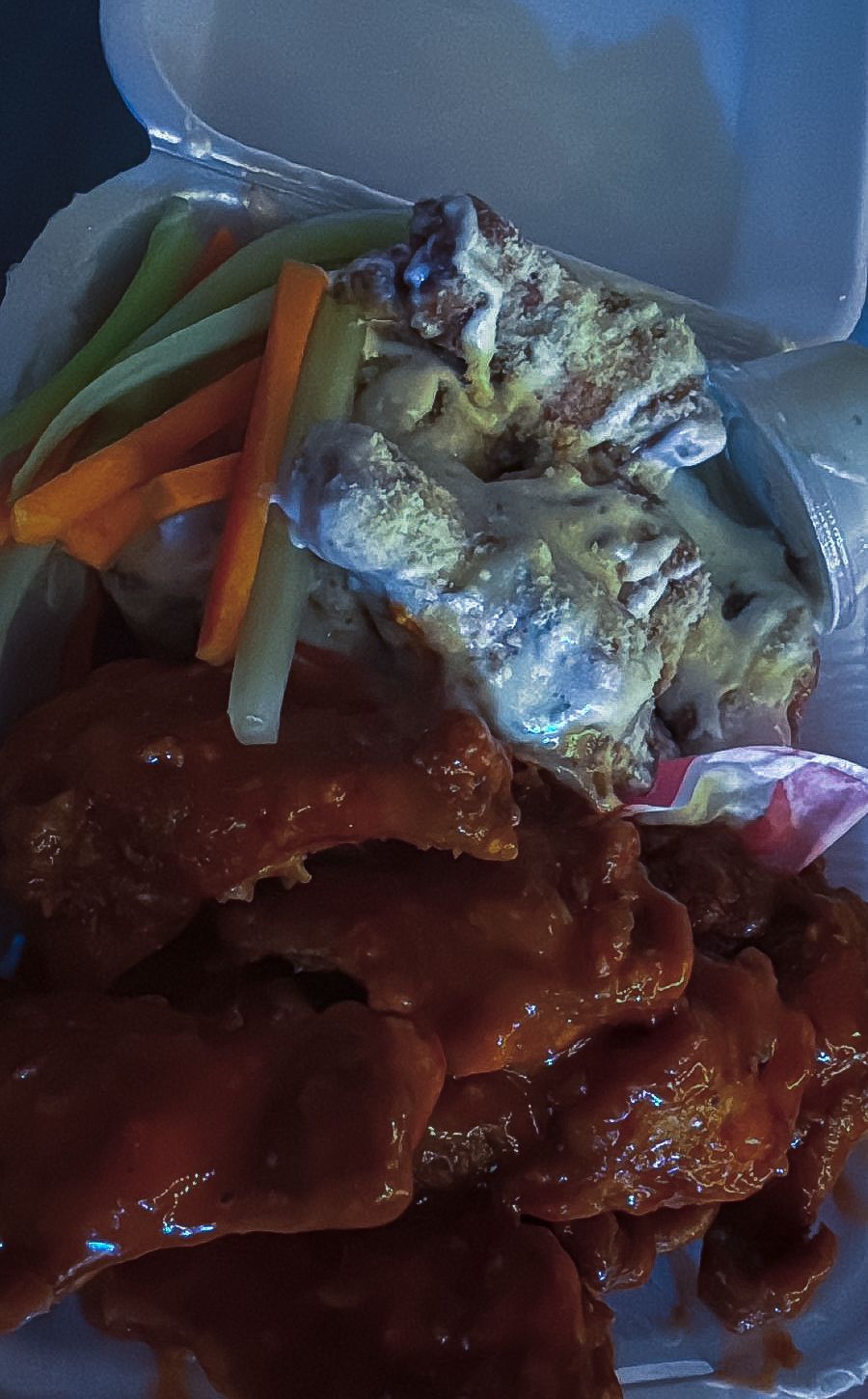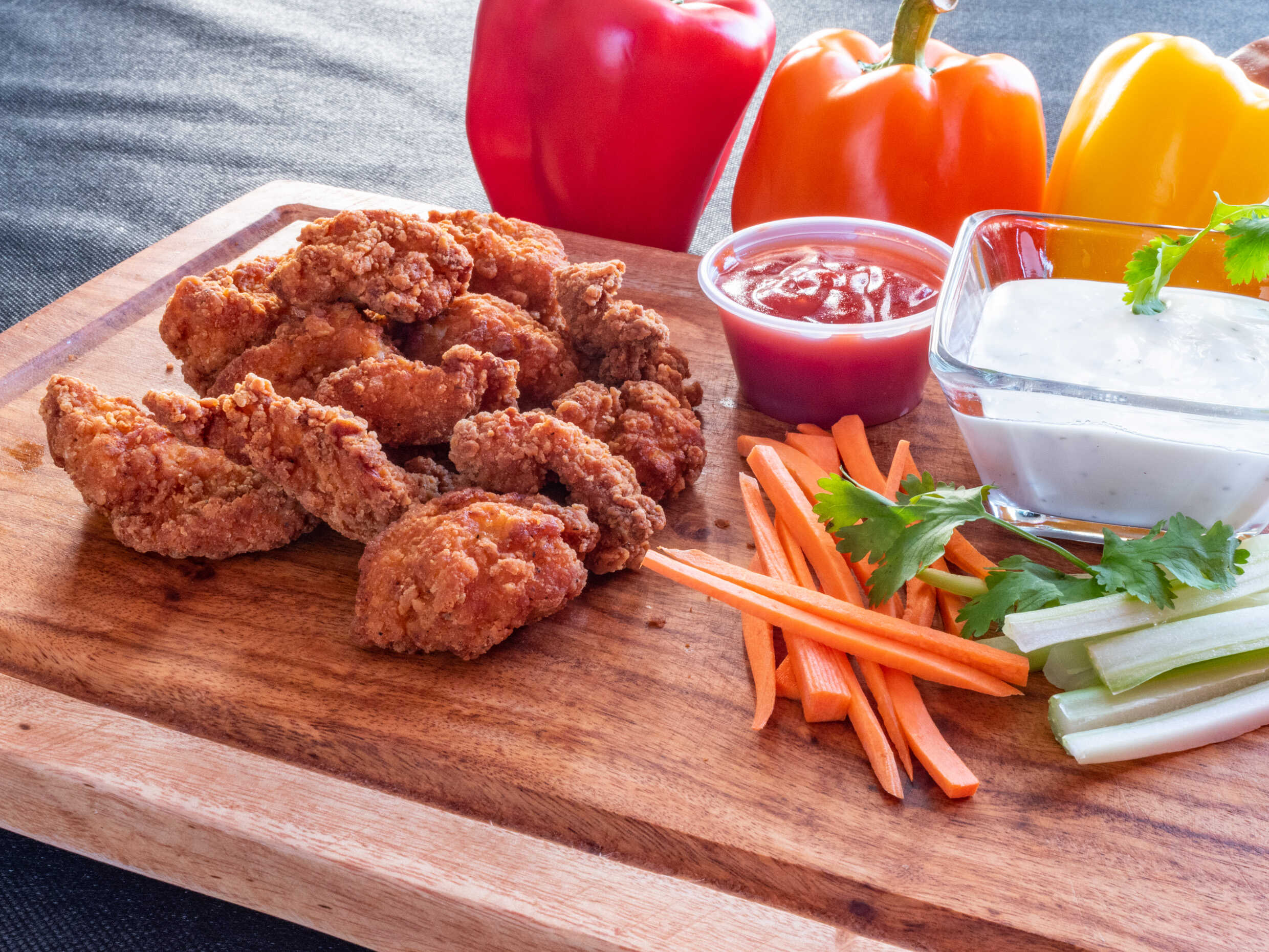 Deliciosas alitas bañadas con salsa secreta de la casa, acompañado de vegetales y aderezo.