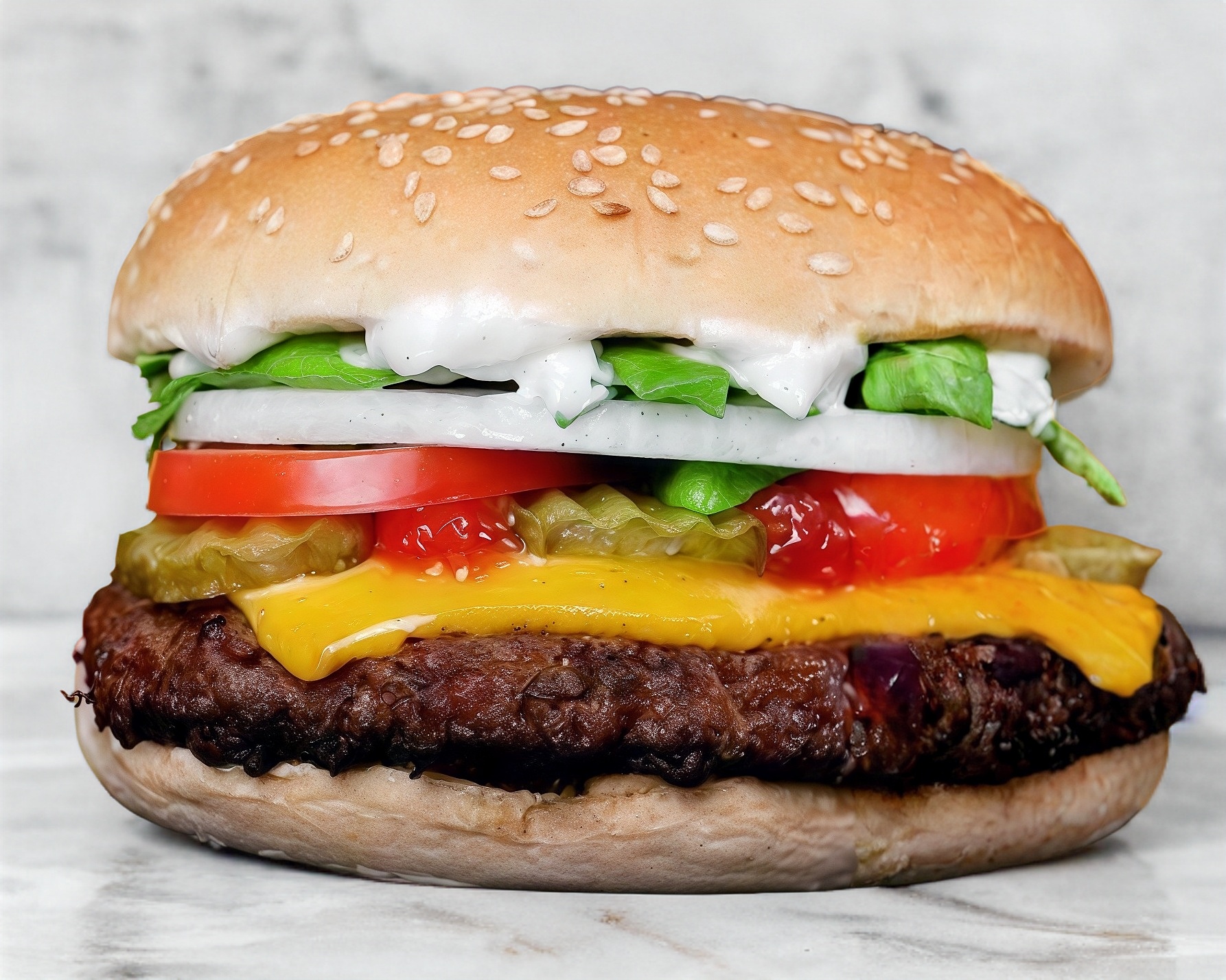 Carne de res 100% de res, verdura, queso americano, pan parrillero y cebolla guisada.