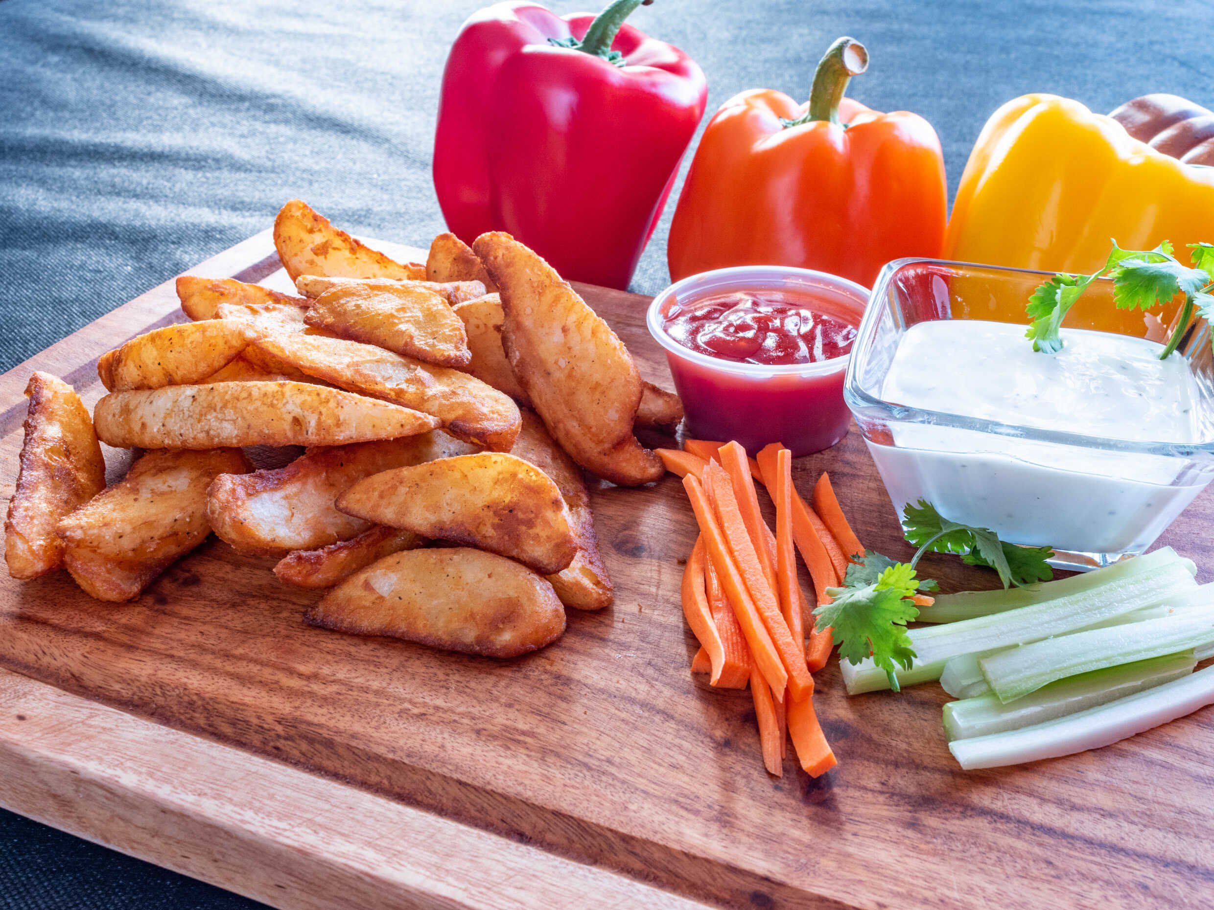 250 Gramos de crujientes gajos de papa sazonada.