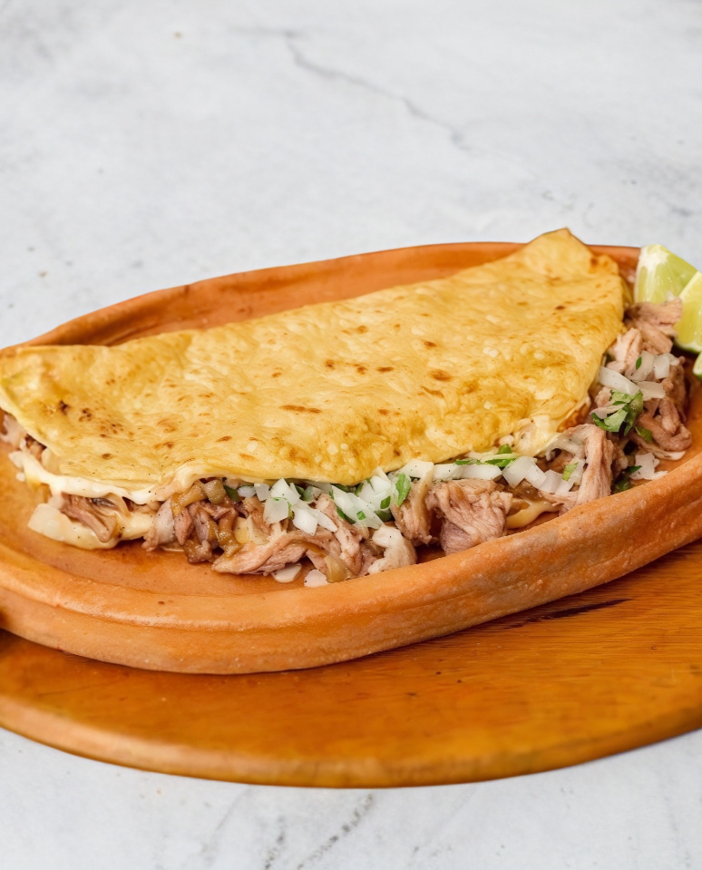 Quesadilla con Birria de res, acompañado de cebolla y cilantro.