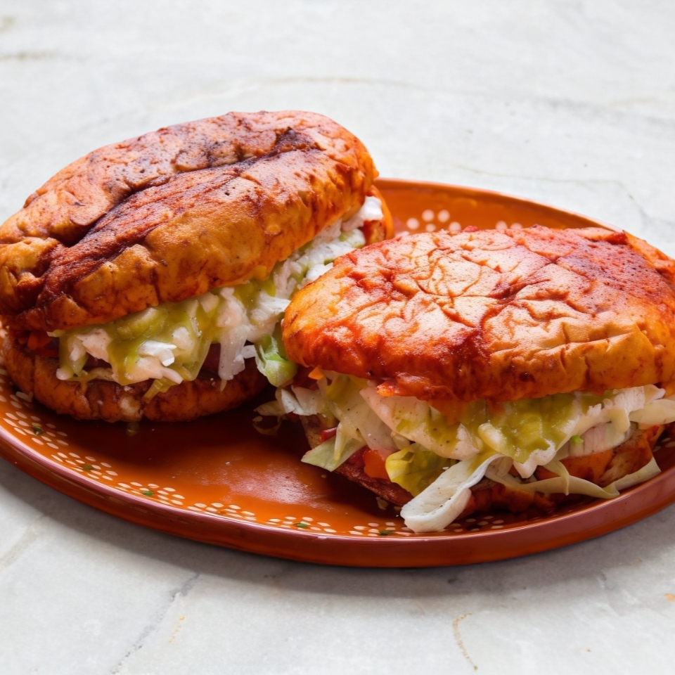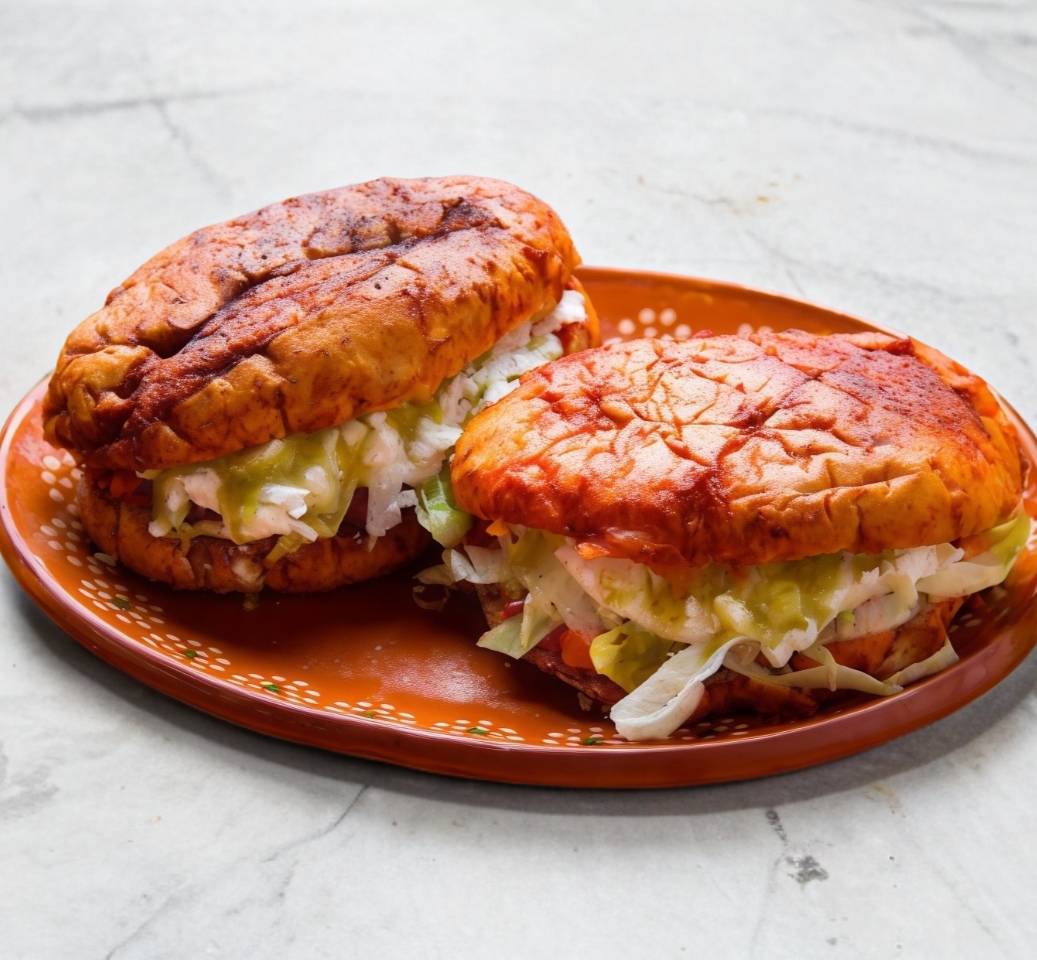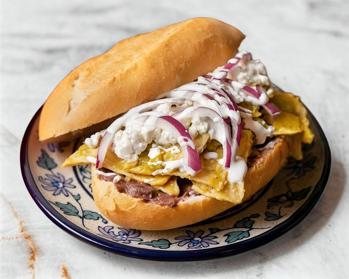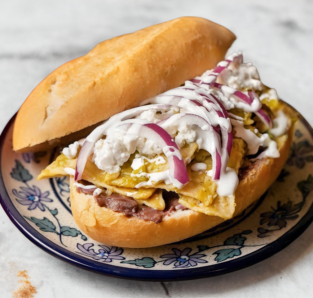 Telera rellena de papas con chorizo . Telera adobada y frita acompañada de lechuga queso y crema