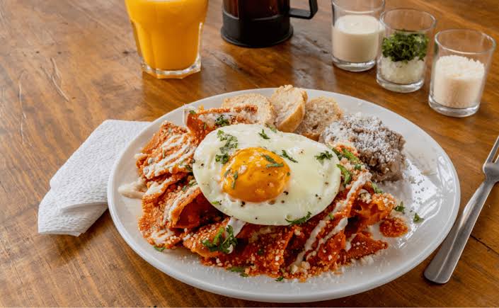 Chilaquiles en salsa verde ó roja incluye frijoles ( un cucharón mediano) y bolillo ( 8 rebanadas ) cebolla, salsa picante, queso y crema ( por aparte)