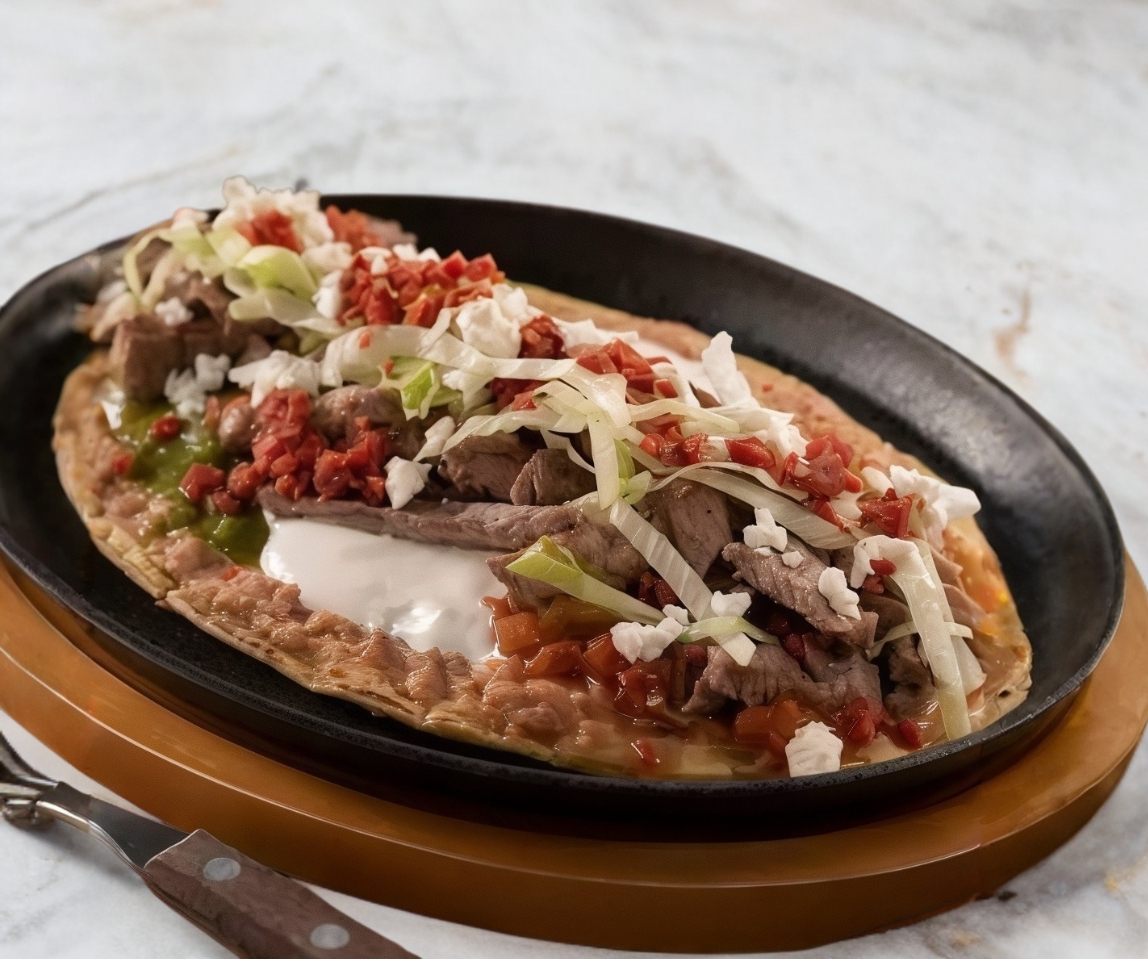 Tortilla dorada de maiz queso y bistek acompañada de cilantro, cebolla