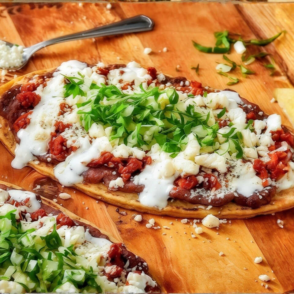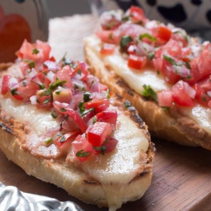 2 mitades de bolillo con frijol y queso acompañado de salsa mexicana