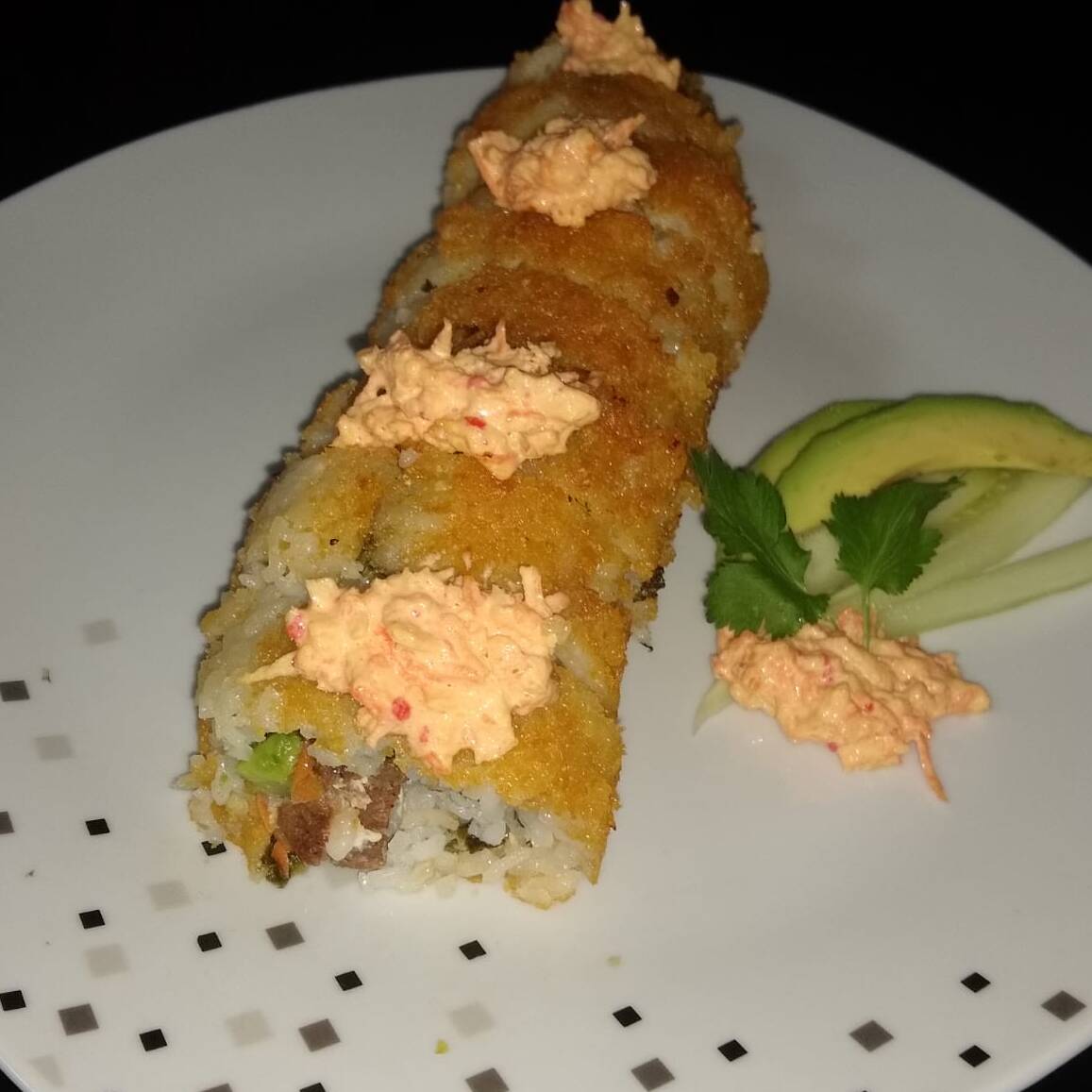 Relleno de camarón, queso Philadelphia, pepino, zanahoria, acompañado de salsa de soya y aderezo de la casa.