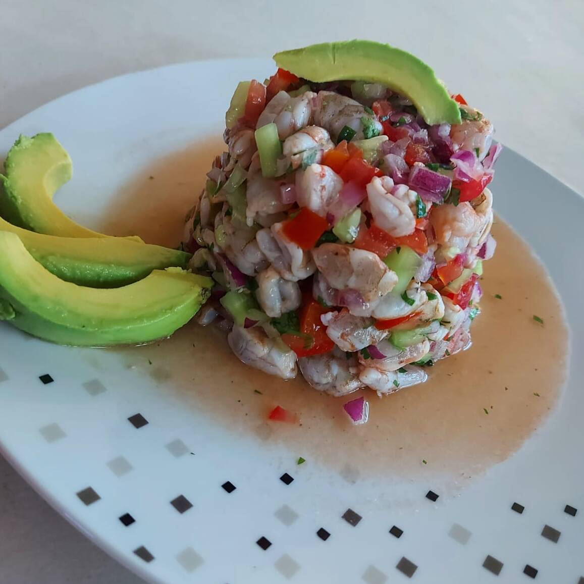 Camarones, pepino, cebolla morada y acompañada de 12 tostadas.
