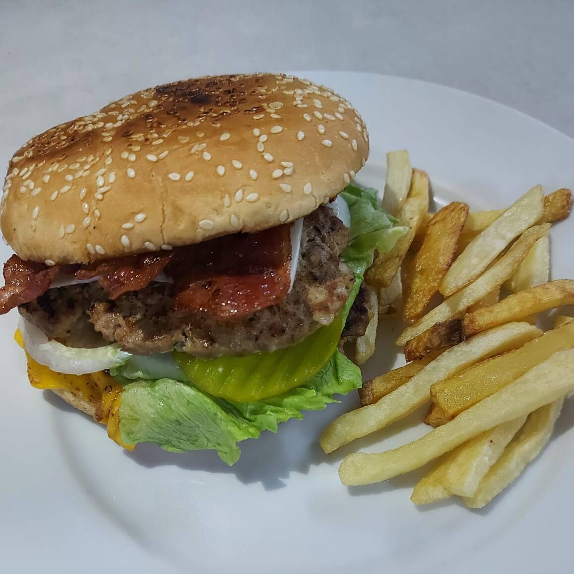 2 Carnes de hamburguesa, tocino, queso amarillo, queso blanco, echuga, jitomate, cebolla, crema y cátsup.