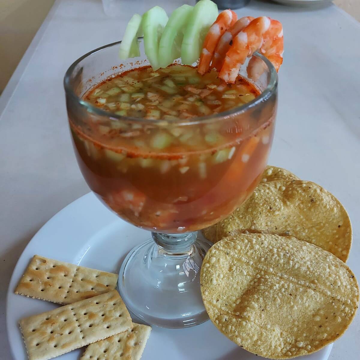 Camarones, pepino, cebolla morada y acompañada de 10 tostadas.