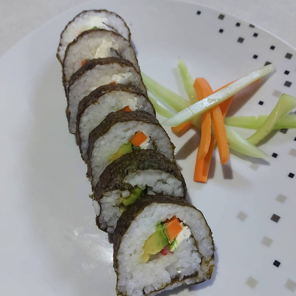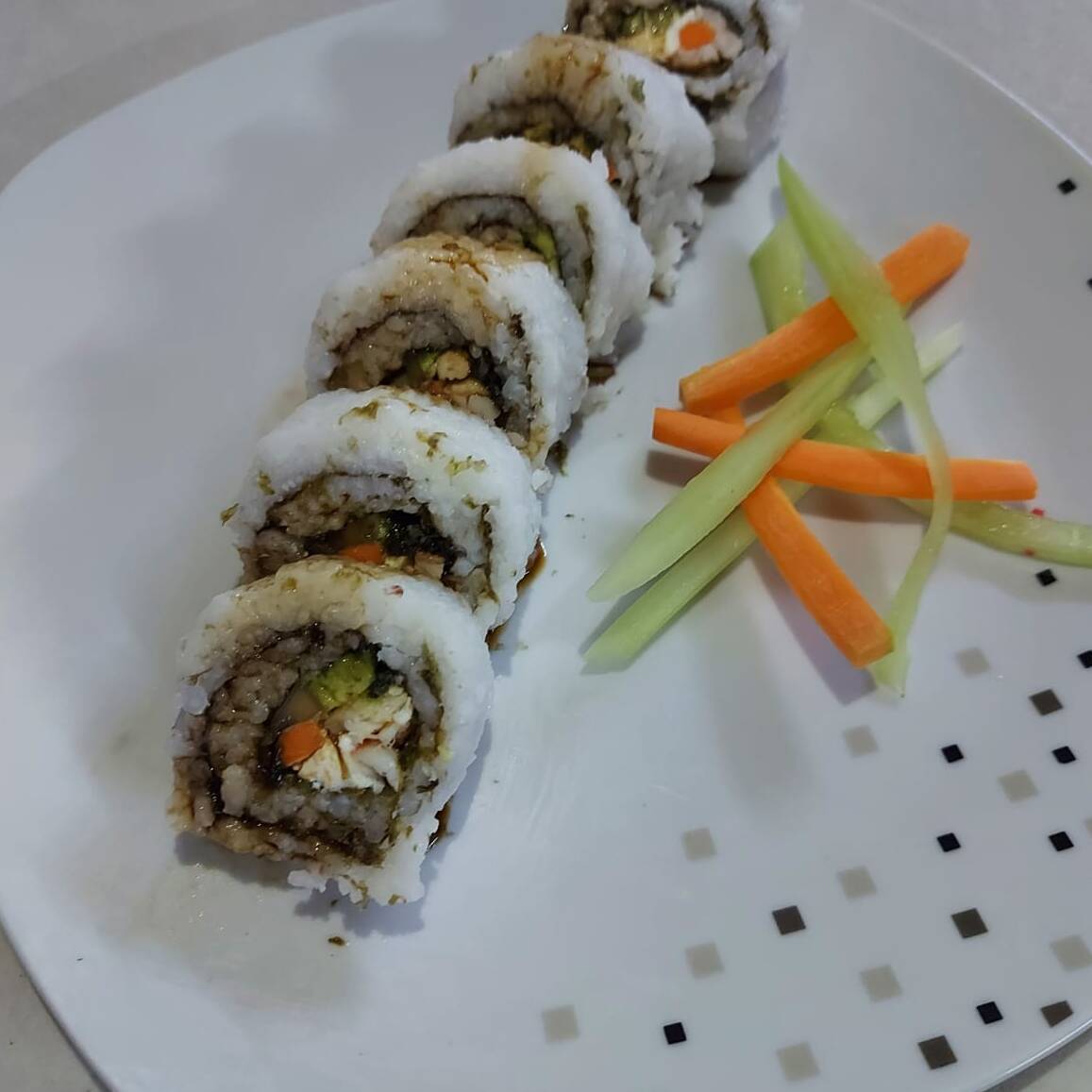 Alga, pepino, zanahoria, Philadelphia, surimi, acompañado de salsa de soya y aderezo de la casa.