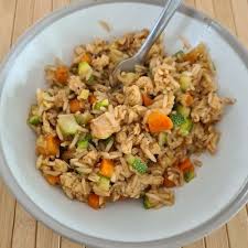 Pollo bañado en salsa agridulce acompañado de arroz frito