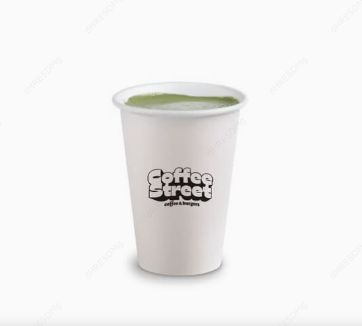 Matcha ceremonial (origen Tsuji San, Uji Japón), no endulzado, mezclado con hielo y leche.