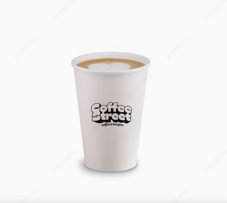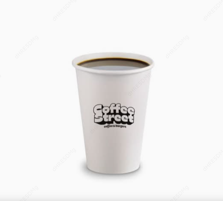 Extracción de café espresso con agua caliente 350 ml, todas nuestras medidas de bebidas son de 12 oz.