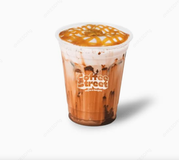 Extracción de café con 320 ml de leche fría, hielos y dos pumps de jarabe de caramelo (todas nuestras medidas de bebidas son de 12 oz).
